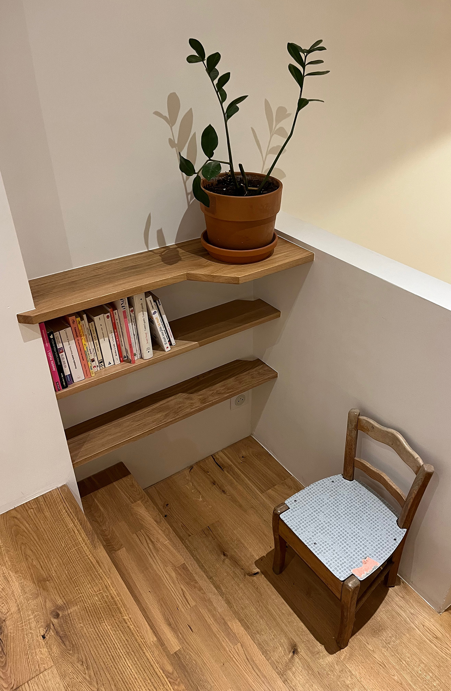 Petit-fils d’ébéniste, j’ai toujours su que je finirais par me lancer. Après d’importants travaux de structure dans notre maison, réalisés en 2019, il restait à concevoir et réaliser l’aménagement intérieur. J’ai vu là une occasion idéale pour me former à travers des projets aussi bien simples que plus ambitieux : expérimenter, progresser, relever des défis et savourer la satisfaction du travail accompli. J’ai encore beaucoup à apprendre, mais je n’hésite jamais à me confronter à la difficulté — elle fait pleinement partie de mon apprentissage.
